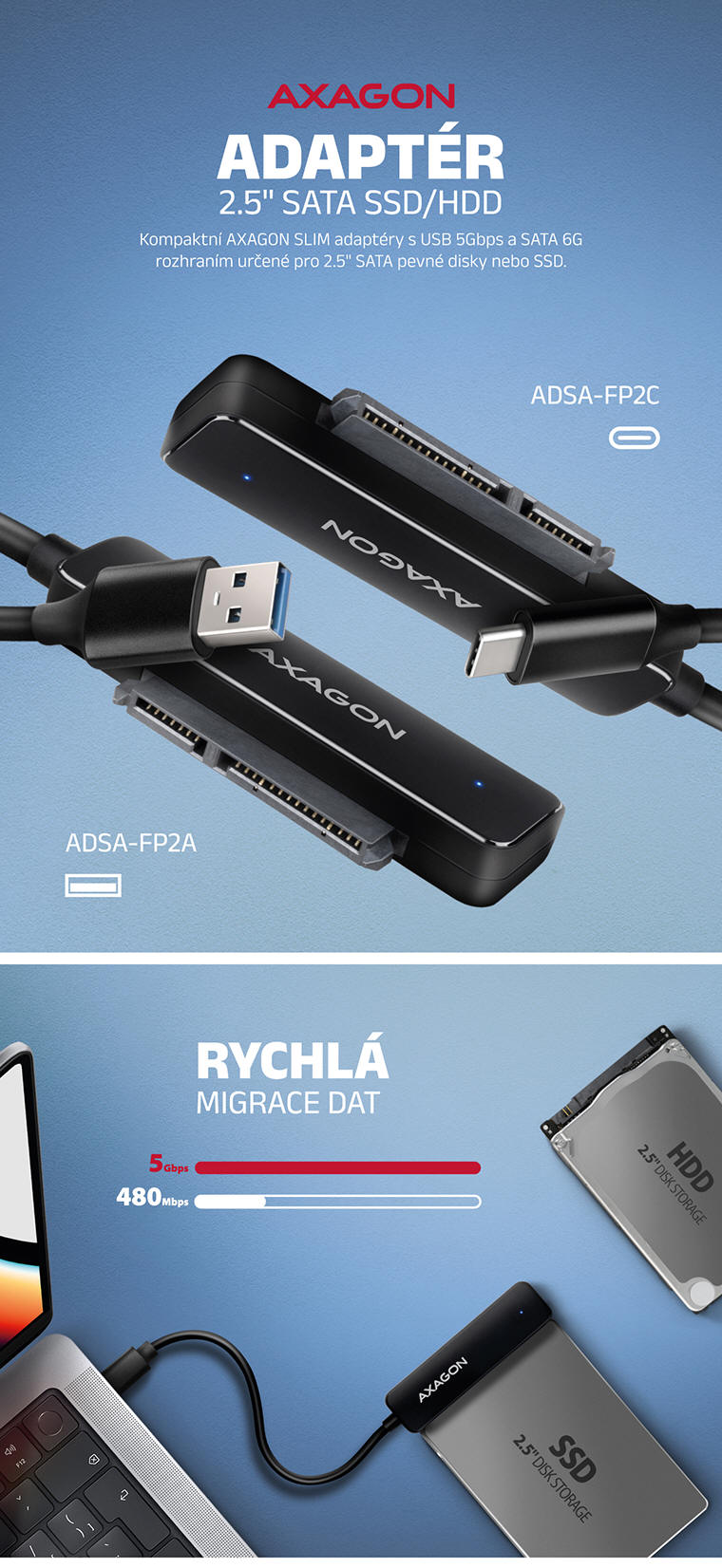 Kompaktní adaptéry určené pro 2.5" SATA pevné disky nebo SSD. ADSA-FP2C / ADSA-FP2A